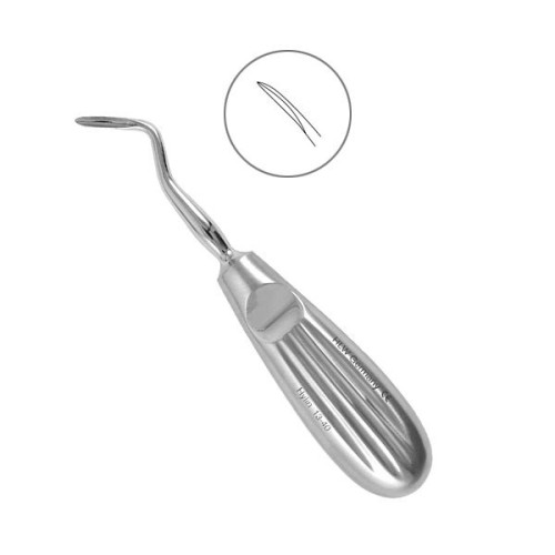 Изогнутый элеватор Hylin 13-40 от HLW предназначается для экстракции зубов с разрушенной коронковой частью или извлечения корней, которые находятся в нижней челюсти. Заточенная рабочая часть, расположенная под углом, позволяет правильно приложить усилие, избегая избыточного травмирования. Элеватор Hylin 13-40 с лезвием в 3 мм легко вводится в лунку, что позволяет быстрее и качественнее выполнять работу. Нержавеющая сталь, из которой сделан инструмент, отличается прочностью и устойчивостью к агрессивным средам.
