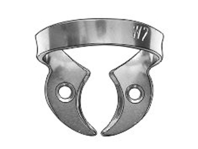 Кламп № W7 ТОР ВМ без крылышек с плоскими щечками, расположенными в горизонтальном направлении, предназначен для установки на молярах обеих челюстей. Он устанавливается на зубы с большой коронкой, на которой выражен экватор.